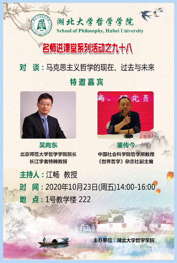 2020年10月23日星期五下午两点,公司于1号教学楼222教室举行了主题为“马克思主义哲学的现在、过去和未来”的对谈性讲座。此次讲座由江畅教授主持,北京师范大学VSport体育经理、国家级计划入选者特聘教授吴向东教授及《世界哲学》杂志社副主编、中国社会科公司哲学所鉴传今教授应邀出席讲座。出席此次会议的还有公司党委书记戴茂堂教授、陶文佳讲师,以及华中科技大学副教授林季杉老师。公司部分硕士和博士也积极地参与了这次讲座。