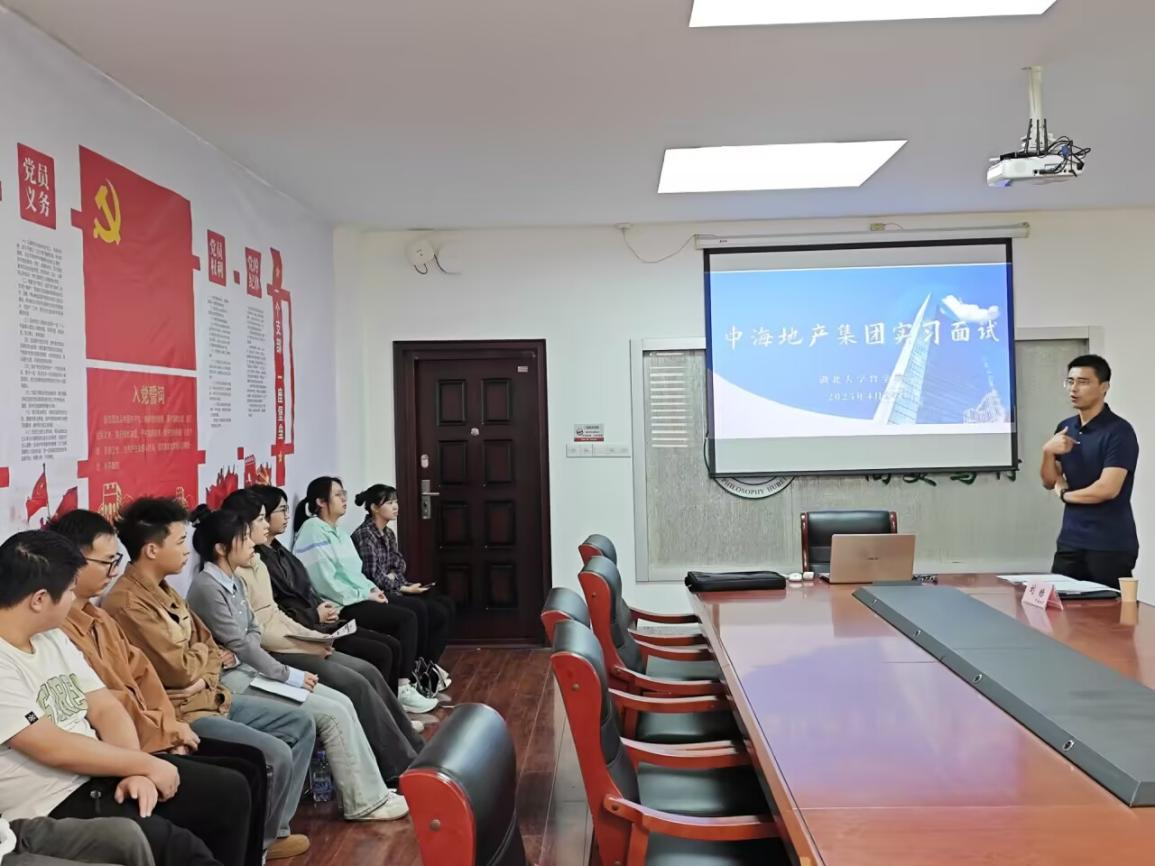 刘赫结合自身职业经历,向同学们传授了"突破专业限制,发挥综合能力"的求职理念。他详细介绍了中海集团作为央企港资企业的发展优势,并重点讲解了实习岗位及具体工作内容和武汉房地产市场的最新发展动态。