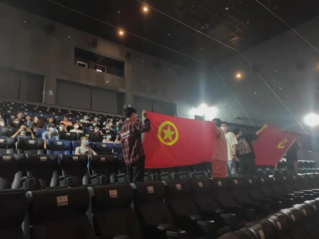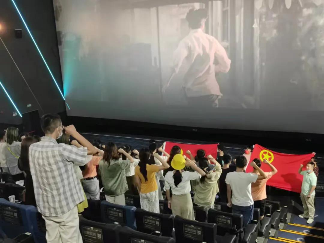 影片开始放映前,同学们陆陆续续到达了影城并依次有序就坐,电影放映中途,哲院团委书记董力带领全体师生,高举右手,重温入党誓词,提升思想认知,坚定理想信念。