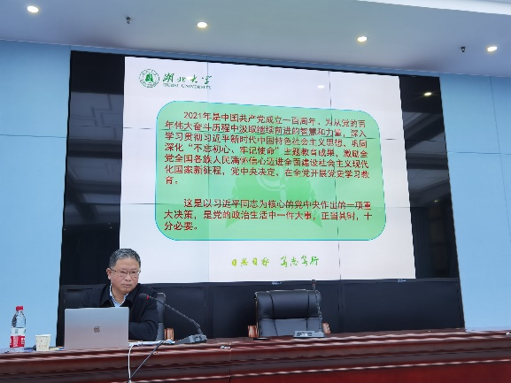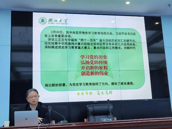 为进一步推进党史学习教育,深刻把握党史学习教育的重点,3月31日下午,湖北大公司党委常委、纪委书记檀坤华同志为VSport体育全体师生党员作了题为“学史明理强信念,自我革命葆青春”的党史学习教育宣讲报告。哲学公司党委书记汤德森主持会议,全体教职工和员工党员共同参加学习。
