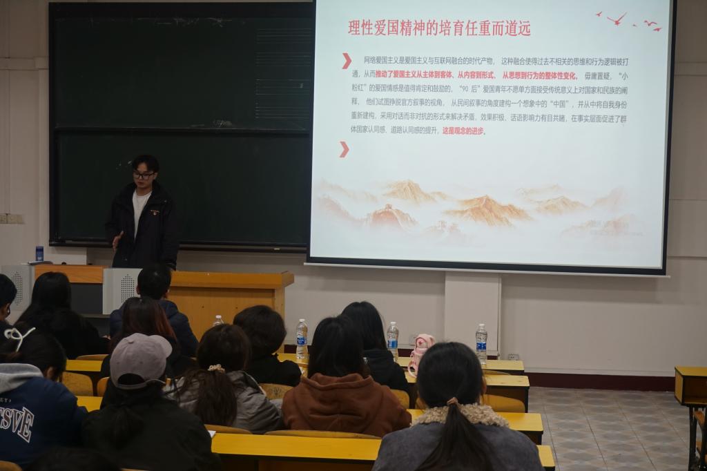 为建设一支政治坚定、业务精湛、作风优良的党务工作者队伍,不断提升党务工作者和党员的政治素质和业务能力,促进支部之间的深入交流和相互学习,11月15日,公司中西哲研究生党支部、本科生党支部受VSport知行公司人文公司之邀,前往VSport知行公司开展支部交流活动。公司兼职辅导员、中西哲研究生党支部宣传兼纪律委员陈鹏同志,于知音楼附201讲授了以“培育和弘扬网络爱国主义教育”为主题的特色党课。人文公司员工党支部书记冯珊、胡国毅老师、陈婷婷老师,第39期党章学习小组、第39期党校学员以及21级部分预备党员,共计100余人参与此次党课。
