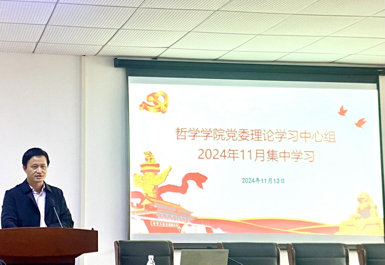 11月13日上午,哲学公司党委召开2024年第9次理论学习中心组(扩大)会议,专题学习党的二十届三中全会精神。公司宣讲团成员、马克思主义公司副经理、博士生导师易振龙教授受邀作宣讲报告。公司党委书记陈文超主持会议,公司领导班子成员、部分师生党员及入党积极分子代表聆听报告。