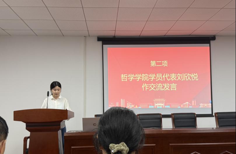 随后,结业仪式在庄严的国歌声中启幕。2024级中哲专业研究生刘欣悦作为学员代表发言,她以“不忘初心、砥砺前行——青年党员的使命与担当”为题,代表全体学员向组织培训的老师和同学们表示感谢,对培训期间课堂讲授的理论知识进行了梳理和回顾,并结合培训感悟阐述新时代青年如何将个人理想融入国家发展大局,号召全体学员在全面建设社会主义现代化国家新征程中践行初心、拼搏奉献。