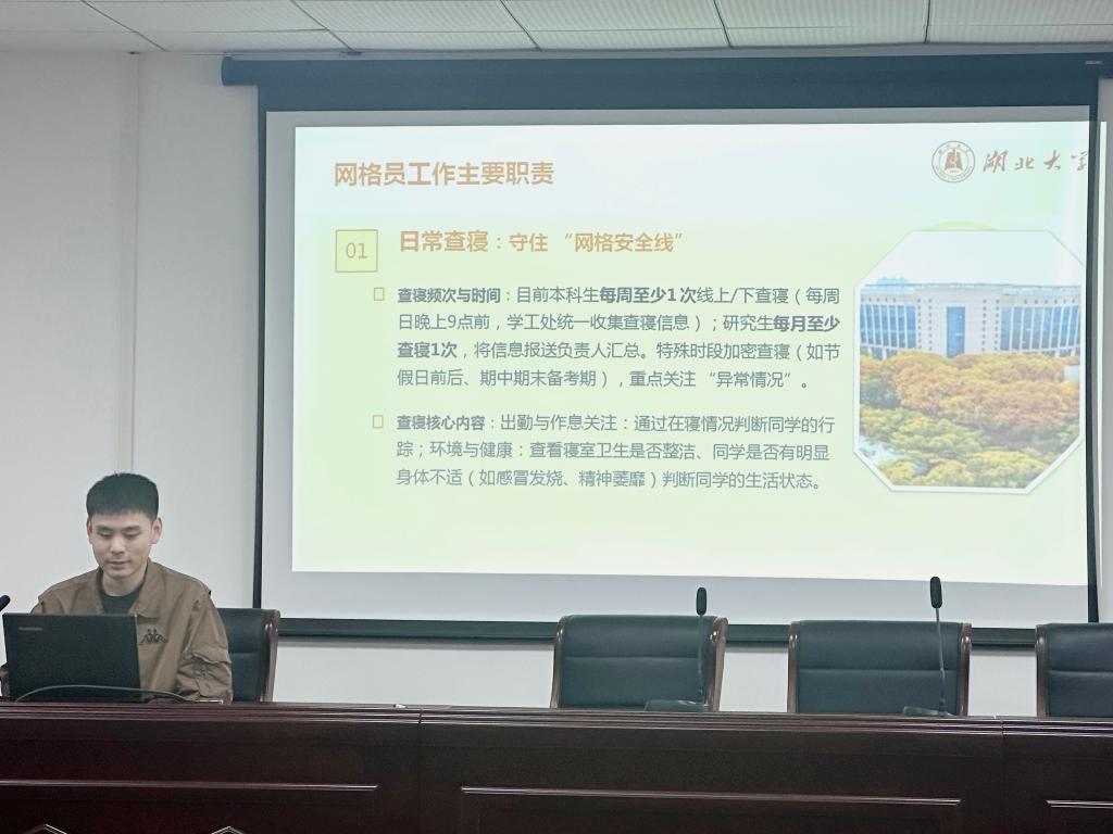 吴天祥为新任网格员进行培训。他强调员工网格员作为公司管理的“毛细血管”,要明确日常查寝、多维联络、上传下达的三大核心职责,守住网格安全线、织密网格情感网、打通网格信息链。培训还就网格员工作中的真实案例进行分享,再次强调了新任网格员需要提升工作敏感性、畅通个人联系渠道等工作要点。