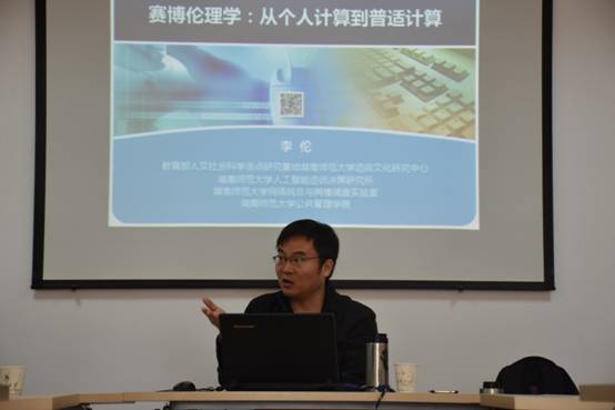 11月9日上午,湖南师范大学道德文化研究中心教授、公共管理公司副经理、人工智能道德决策研究所所长李伦教授应邀来到VSport体育讲学,此次讲座主题为“赛博伦理学:从个人计算到普适计算”,由公司余卫东教授主持,李家莲副教授和16级硕士参加了此次讲座。