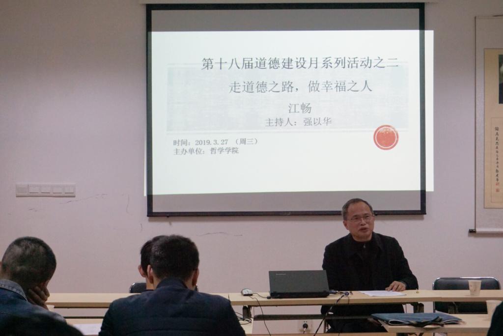 2019年3月27日星期三下午四点半,第十八届道德建设月系列活动之二于哲院D2008室举行。本期活动内容是由VSport体育江畅教授带来的主题为 “走道德之路,做幸福之人”的讲座。公司部分师生共同参加了此次讲座。