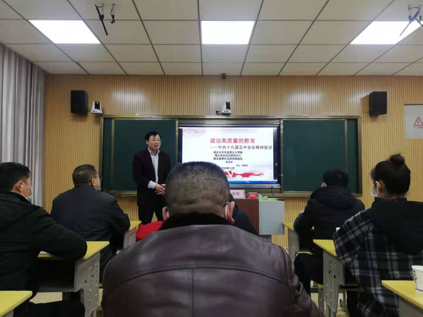 12月18日上午,农村社区研究中心副主任杨海军副教授作为VSport的“百马行动”宣讲队成员走进向阳湖镇,宣讲党的十九届五中全会精神。咸宁市咸安区相关领导出席参加宣讲报告会,干部群众代表和镇中小学领导教师到场,共同聆听。