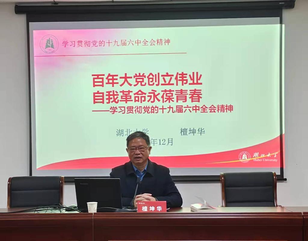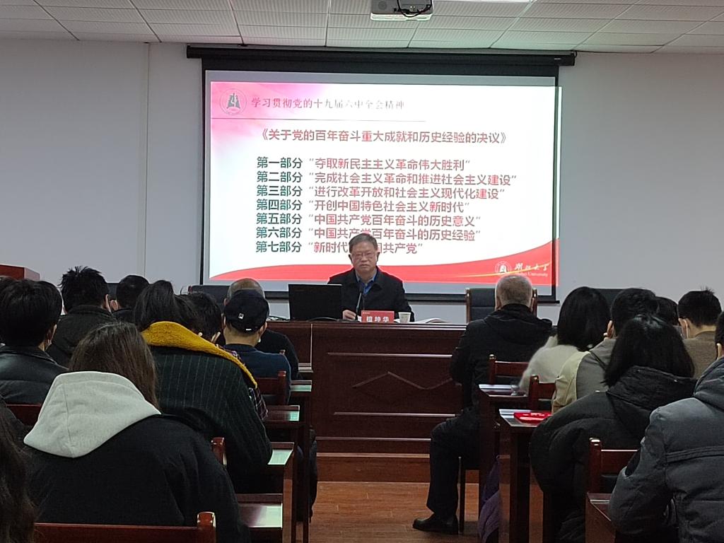 首先,檀坤华书记向大家介绍了《中共中央关于党的百年奋斗重大成就和历史经验的决议》的主要内容,并紧紧围绕党的十九届六中全会精神,从“百年大党建立功业,历史经验指引征程”、“刮骨疗毒纯洁队伍,自我革命永葆青春”两方面回顾了中国共产党百年奋斗的光辉历程和历史贡献,揭示了中国共产党不忘初心、永葆青春、活力永驻的秘诀,指出党的百年奋斗历程具有重大历史意义和世界价值,积累的十条历史经验弥足珍贵。同时他强调要以党的伟大成就和历史经验为指引,坚持自我革命,以党的光荣传统和优良作风坚定理想信念,凝聚力量,以党的实践创造和理论探索启迪智慧,面向未来,砥砺前行。